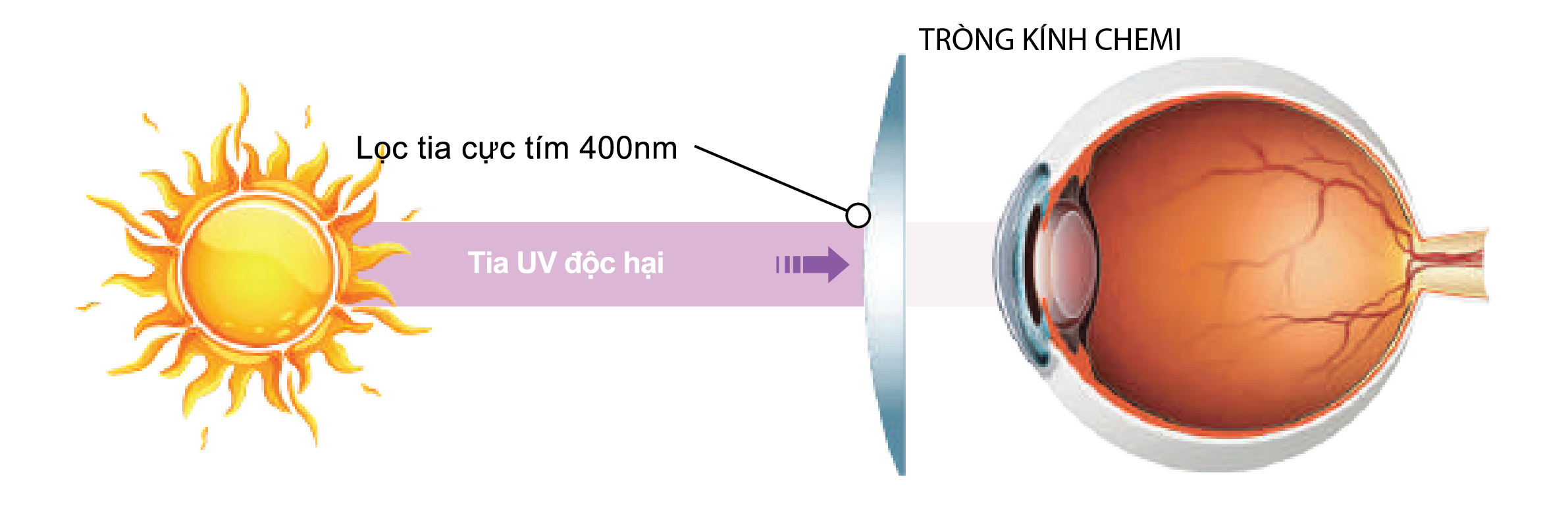 - Tia UV( Ultraviolet) là bức xạ mà chúng ta không nhìn thấy được, nguồn chính từ ánh sáng mặt trời. Việc mắt tiếp xúc với tia UV lâu dần sẽ làm cho mắt lão hóa sớm, nguy cơ đục thủy tinh thể và viêm giác mạc.