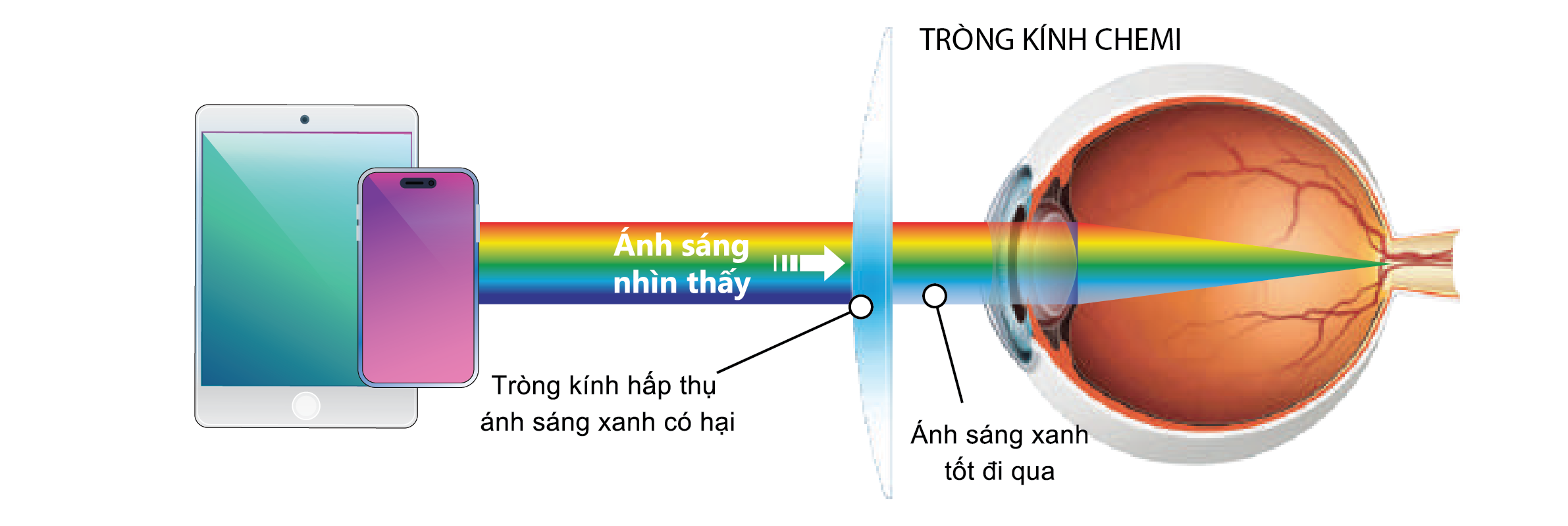 - Ánh sáng xanh (HEV – High Energy Visible Light) là ánh sáng nhìn thấy được với bước song từ 385~445mm nguồn chính từ các thiết bị điện thoại, laptop, TV và đèn LED…Mắt tiếp xúc với nguồn ánh sáng xanh cũng sẽ gây ra các hiện tượng như mỏi mắt kỹ thuật số, rối loạn giấc ngủ và nguy cơ tổn thương võng mạc lâu dài.